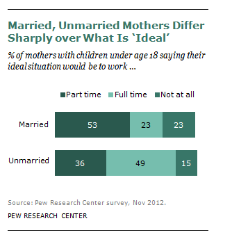 For most American mothers, part-time work would be their ideal work situation, preferred over full-time work or not working at all outside the home. However, there are sharp differences among views of mothers based on factors such as economic circumstances and marital status.