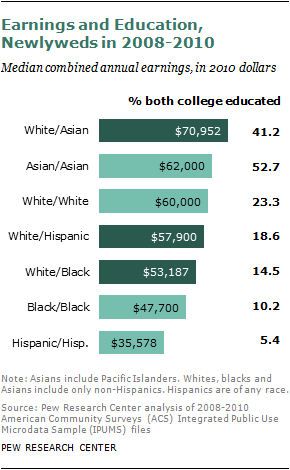 Much of the earning gaps among couples can be linked to educational differences. In about four-in-ten intermarried white/Asian newlyweds (41%) both husband and wife are college educated, compared with 23% of white/white couples, 19% of white/Hispanic couples, and 15% white/black couples. (Asian/Asian couples are the most educated, but their combined earnings are somewhat lower than white/Asian couples).