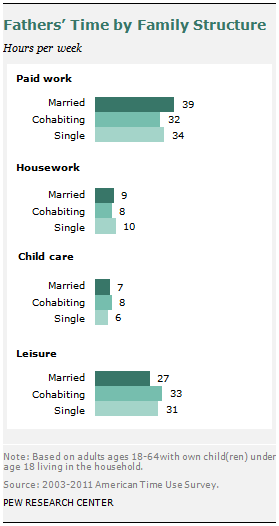 Compared with fathers who are married or living with a partner, single fathers spend more time doing housework (averaging 10 hours per week), but less time in childcare (6 hours per week). Single fathers’ time in paid work is less than that of married fathers, but more than that of cohabiting fathers.