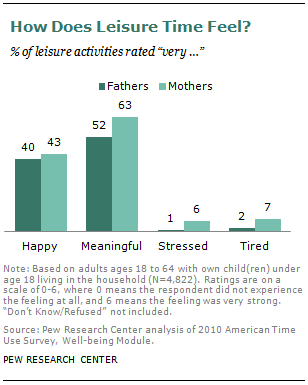 leisure 2The ATUS not only asks people how they spend their time but also how they feel while they’re engaged in particular activities. Our analysis of this data shows that mothers find their leisure time to be more meaningful than do fathers. Mothers rate 63% of their leisure activities “very meaningful,” while fathers give a similar rating to about 52% of their leisure activities. Meanwhile, mothers feel more exhausted than fathers during their leisure time, and their stress level associated with leisure time is higher as well.
