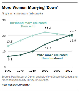 Among married women in 2012, 21% had spouses who were less educated than they were—a threefold increase from 1960, according to a new Pew Research Center analysis of Census data.